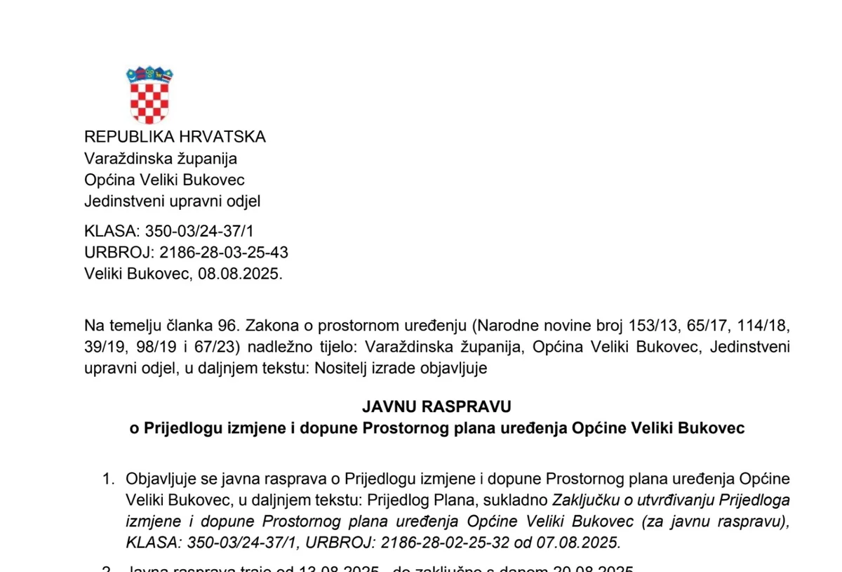 Sukladno odredbama Zakona o zaštiti okoliša („Narodne novine“ broj 80/13, 153/13 i 78/15) i Uredbe o informiranju i sudjelovanju javnosti i zainteresirane javnosti u pitanjima zaštite okoliša (Narodne novine broj 64/08), Općina Veliki Bukovec, a nakon provedenog postupka ocjene o potrebi strateške procjene utjecaja na okoliš za Izmjene i dopune Prostornog plana uređenja Općine Veliki Bukovec, objavljuje informaciju o donošenju Odluke kojom se utvrđuje da nije potrebno provesti stratešku procjenu utjecaja na okoliš za izmjene i dopune Prostornog plana uređenja Općine Veliki Bukovec.
